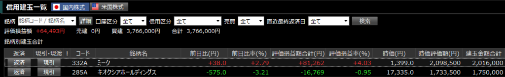 特定口座(チャレンジ枠)は信用取引を活用しリターンを求めながらも、フルレバを避け、2倍前後で運用しています。基本的には数日~数週間のスイングですが、平日仕事が休みの場合デイトレをすることもあります。